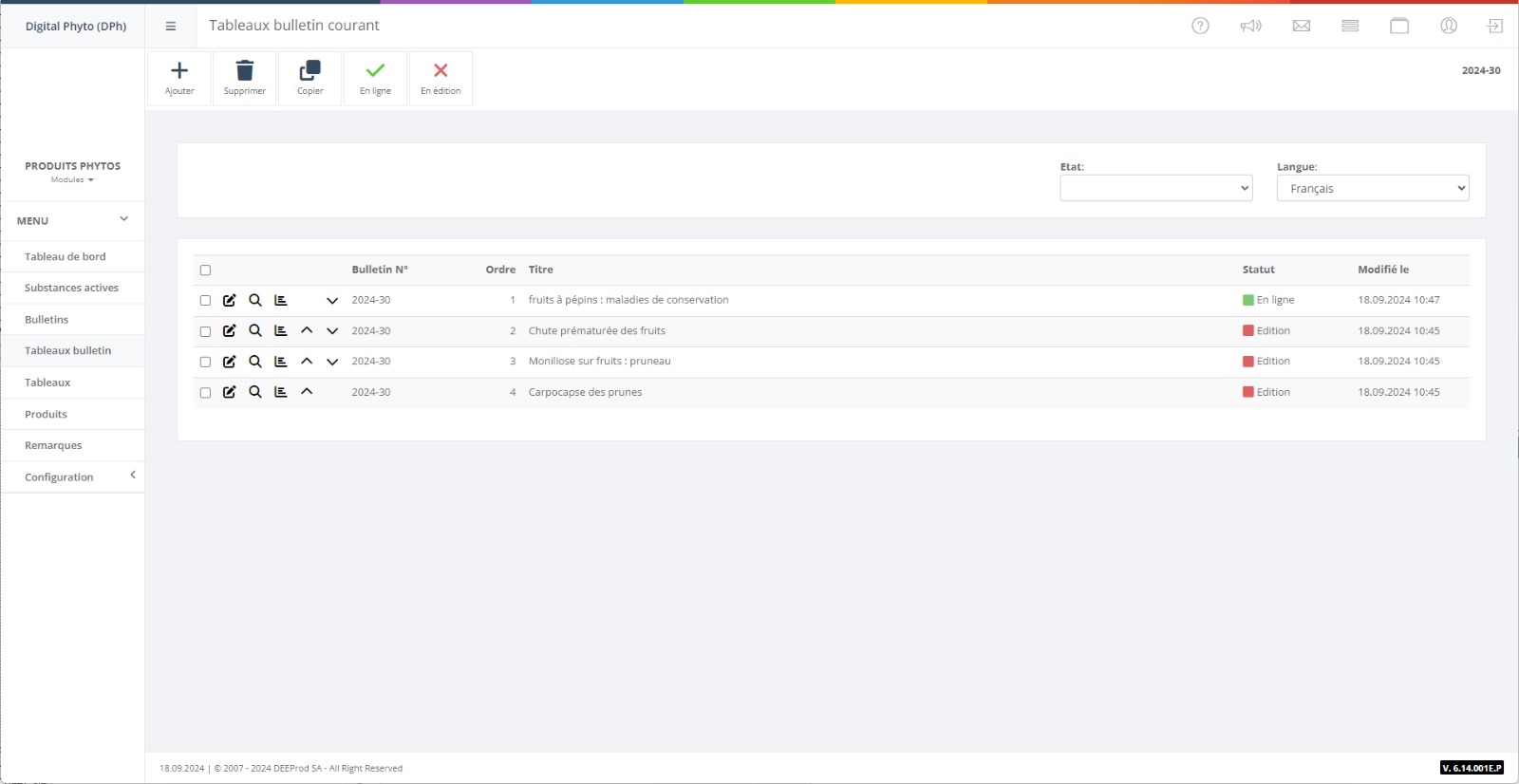Il intègre l’administration de tableaux matriciels basés sur les données phytosanitaires de l’Office fédéral de la sécurité alimentaire et des affaires vétérinaires (OSAV). À partir de ces tableaux, le système permet ensuite de générer des bulletins d’information, en plusieurs langues, destinés aux professionnels des différentes filières agricoles.